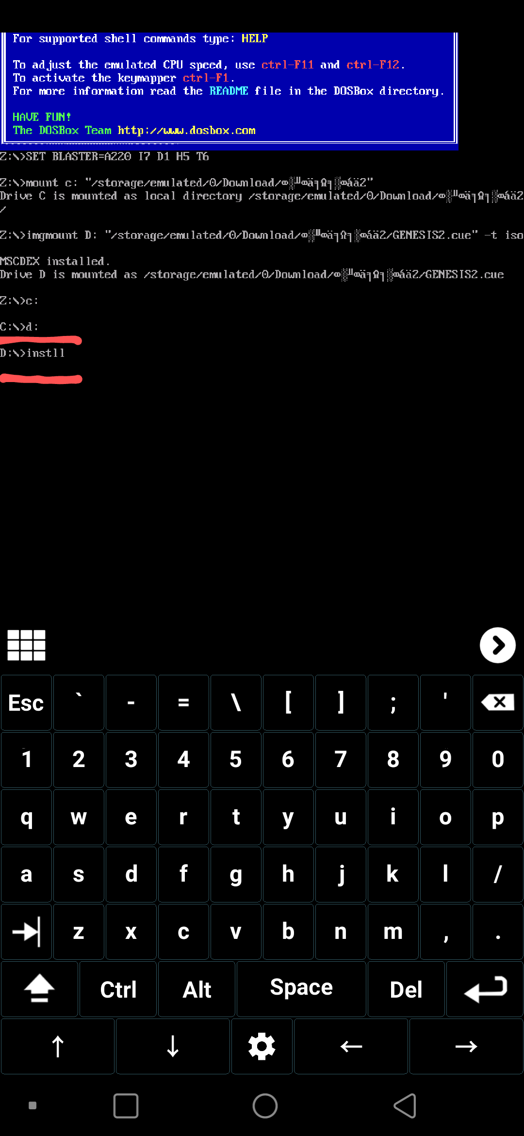 도스 화면이 나옵니다. c: 에서 d: 로 눌러이동후 install 을 눌러주면 됩니다.